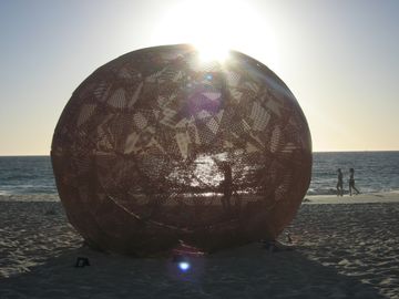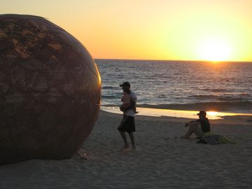 Sunset is an iconic moment in Western Australia, the sun hovers above the horizon, becomes almost fluid as it settles and dissolves into the sea. Aube is that moment, frozen on the sand of Cottesloe Beach.