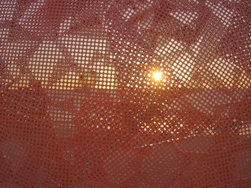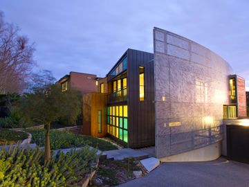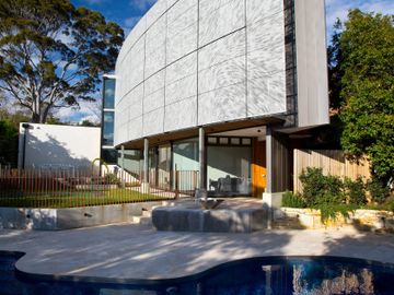 Kew House is a private residence in Kew, Melbourne. It is included in my Public Art works because the entire northern façade is a perforated aluminium, openable screen, the image taken from BUSH MEDICINE DREAMING, 2004 by Gloria Petyarre with her permission and acknowledgement. The sunlight that penetrates through the screen, projects the stylised image of the painting onto the internal walls and floor, arcing through the house. Fragments of the image are backlit at night as room are occupied.