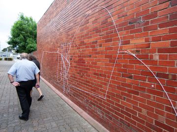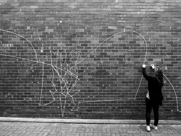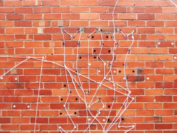 As a second iteration of COMMUNITY, all of the acrylic mirror bricks were stealthily removed leaving only the Velcro dots. Wool purchased from the Salvation Army store behind the brick wall, presented an opportunity for expression through an interactive join-the-dots with the public in the laneway.