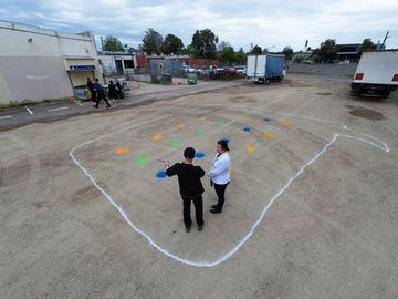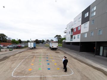 he As a Transformation proposal to the City of Greater Dandenong in a Noble Park carpark, PLAYFUL LANGUAGE is both an invitation to play a game of twister for the parking cars and, when viewed form the adjacent apartment building, a talk bubble of a the communal language of colour, asking …?
